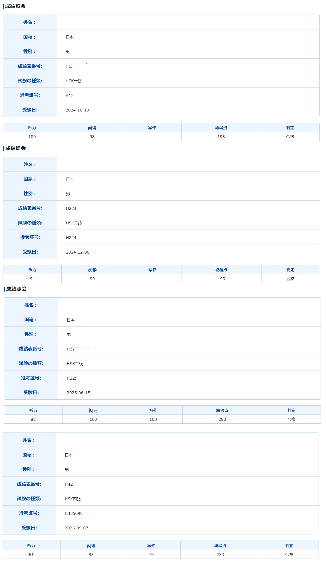 わたしはこれまで、HSK1級からHSK4級までを受験し、1発合格してきましたので、
